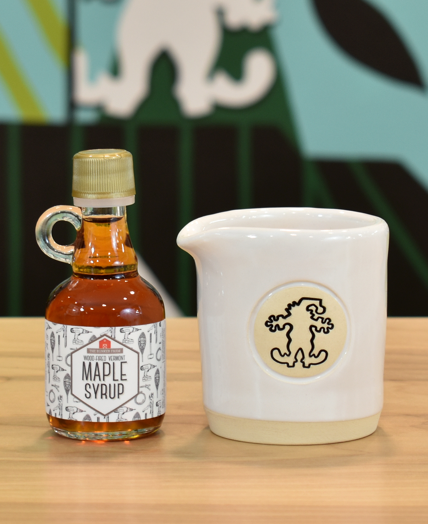 Stave Maple Syrup Pitcher: Enjoy the pour from this petite stoneware pitcher holding 3 to 4 oz. of maple syrup (liquid gold as we Vermonters call it). Included with your handmade pitcher is a 40mL nip of the sweet stuff harvested from Bunker Farm in Dummerston, Vermont.