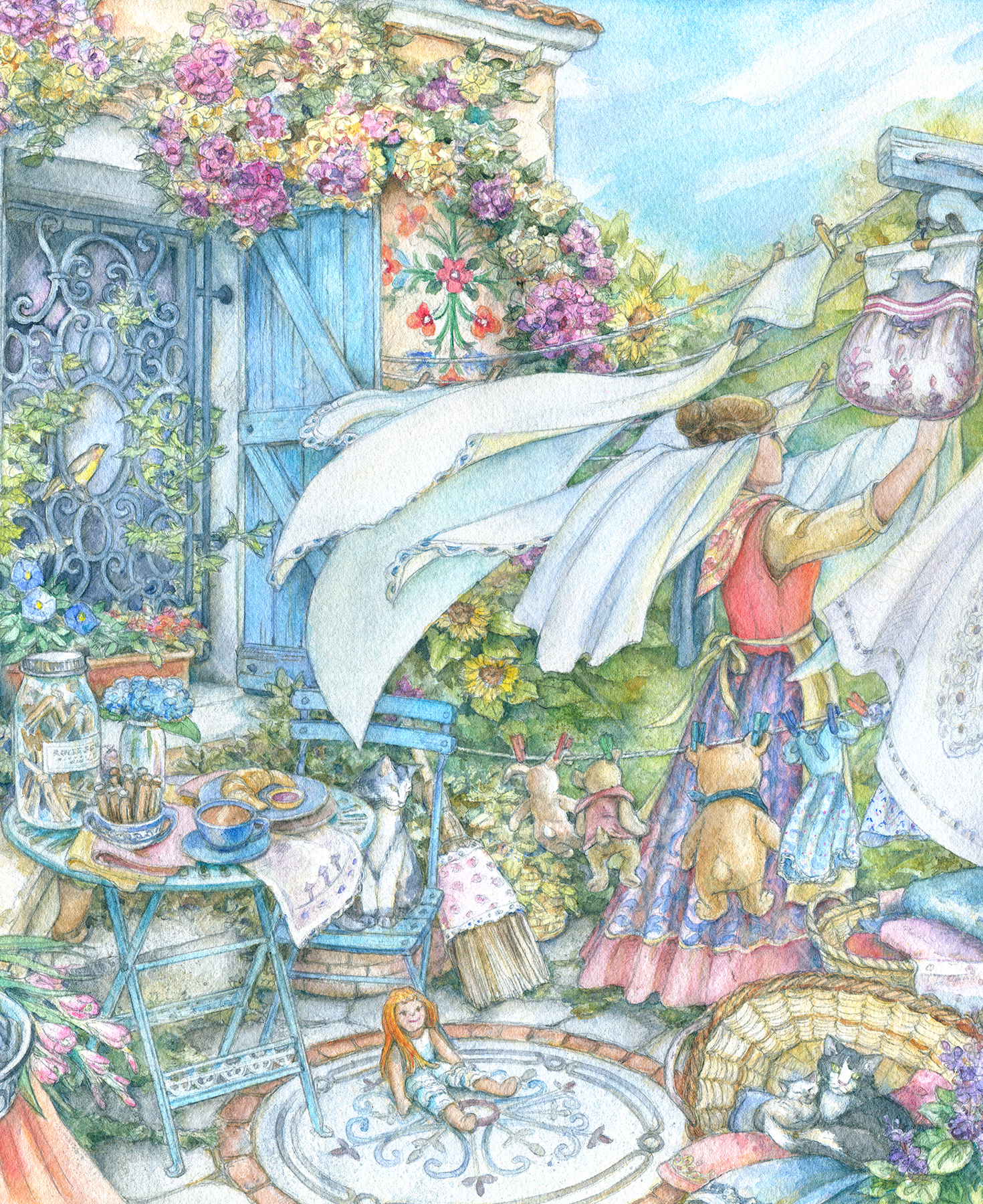 In this bustling scene, a woman works diligently, stringing towels and teddy bears on the clotheslines to dry, while curious cats in the foreground watch and try to make sense of it all. In Kim Jacobs’ Laundry Day, you can admire her skill and attention to detail, set against a lush garden setting replete with overflowing flower pots and garden furniture.