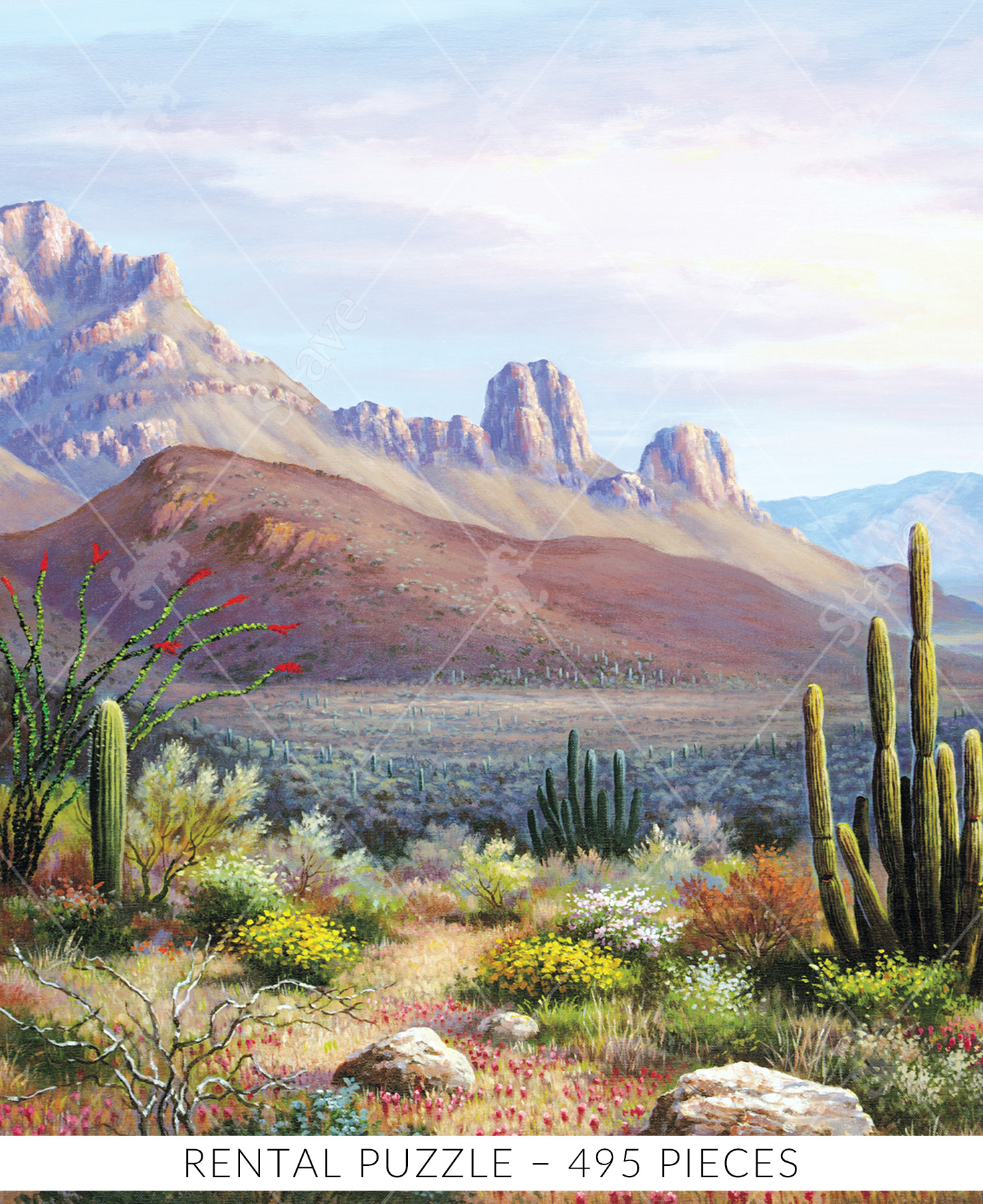 Watch the beauty of the Sonoran Desert come to life with the Sonoran Sunset wooden jigsaw puzzle! This puzzle showcases an array of cacti, shrubs, and wildflowers that grow at the base of the foothills. Each flower and cactus is bold and vibrant, making this puzzle a joy to complete. The pastel hues of the sky suggest that the sun is setting over a mountain range in the distance, casting shadows over the desert floor. While assembling this puzzle, you'll feel like you're taking a serene walk through the desert at sunset. Why not try your hand at piecing together this captivating puzzle and experience the magic of a Sonoran Sunset for yourself?