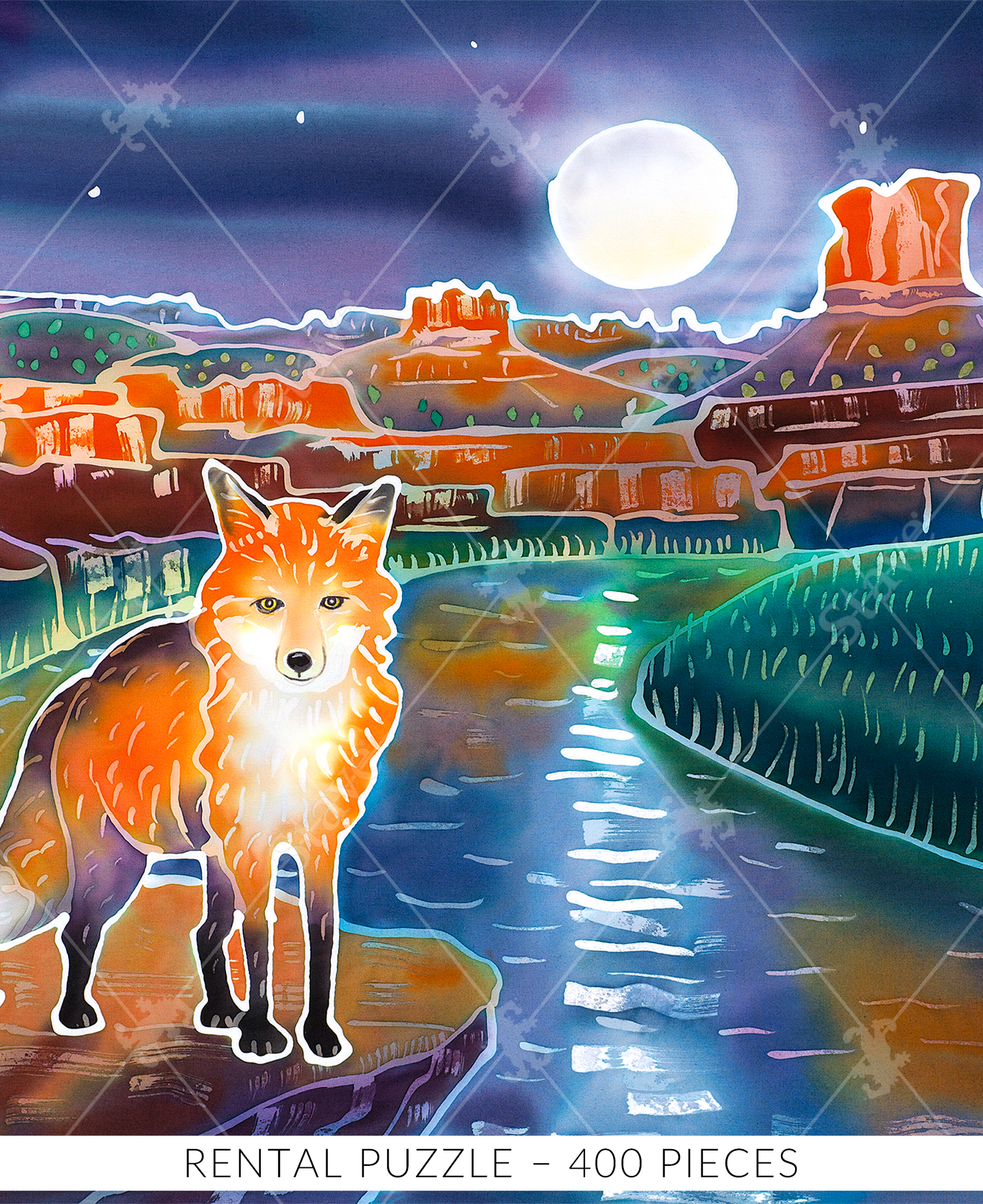 As the sun sets and the night sky takes over, the Night On The Town wooden jigsaw puzzle reveals a whole new world. The mysterious scene depicts a fox standing on the side of a cliff, overlooking a flowing river that cuts through the land. The plateaus stretch up towards the glowing moon, igniting a sense of adventure within your soul. This puzzle, piece by piece, lets you explore a world of possibility under the cover of darkness with the company of a clever fox. A night on the town has never been more adventurous.