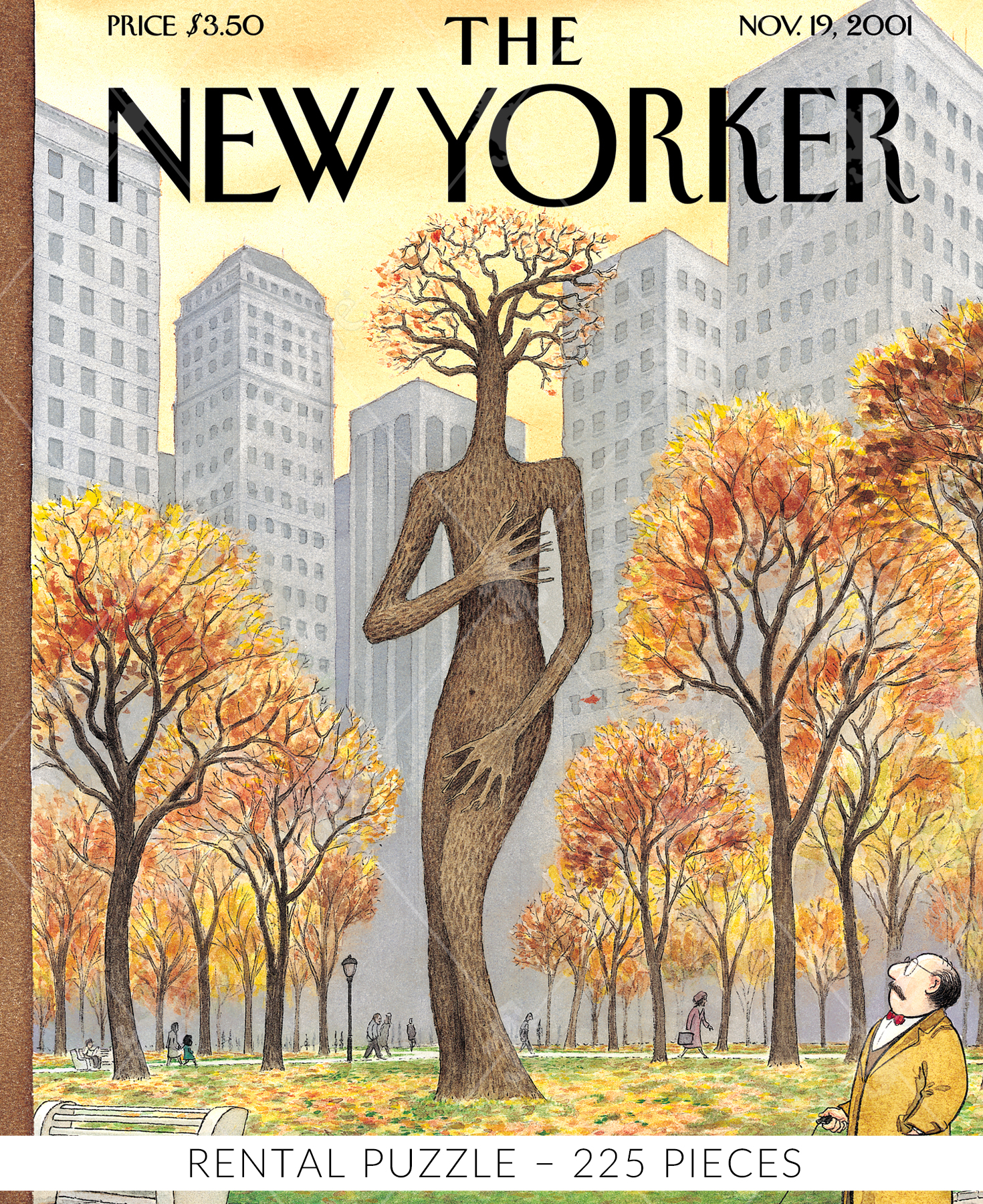 As the leaves change color, we start to see the true beauty of autumn. And what better way to capture that beauty than with a wooden jigsaw puzzle of a New Yorker cover? This particular puzzle features an incredible image of a tree standing tall in the center of a city park. The tree's trunk is shaped like a human body, and its branch arms drape down to cover its modesty. As a man strolls through the park with his furry friend, he can't help but gaze up at the magnificent tree and take in all its glory. This puzzle is the perfect way to spend a cozy autumn evening, piecing together a work of art that truly captures the essence of New York City.