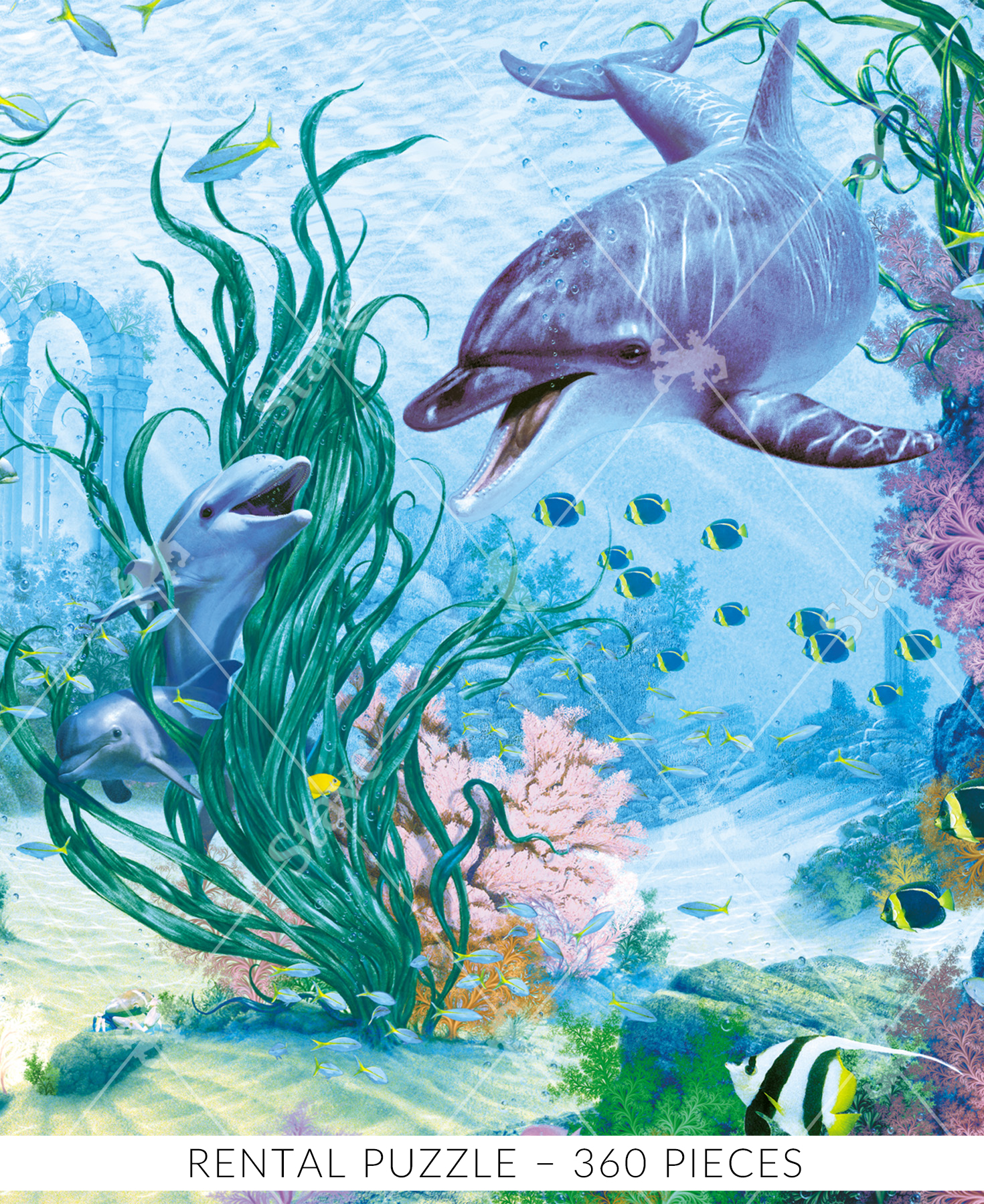 It's time to dive into the deep blue sea and join a family of playful dolphins! Playtime! wooden jigsaw puzzle offers a whimsical underwater scene where a dolphin and her two energetic calves frolic in the midst of seaweed and coral. Surrounding the family are a plethora of aquatic life, from schools of colorful fish to shy but curious sea creatures. In the distance, beyond the verdant vegetation, lie mysterious and beautiful stone archways. It's a fascinating sight that invites you to lose yourself in the fantastic world beneath the waves. Get ready for an unbeatable playtime that will leave you yearning for more of the stunning creatures and sights found under the sea!